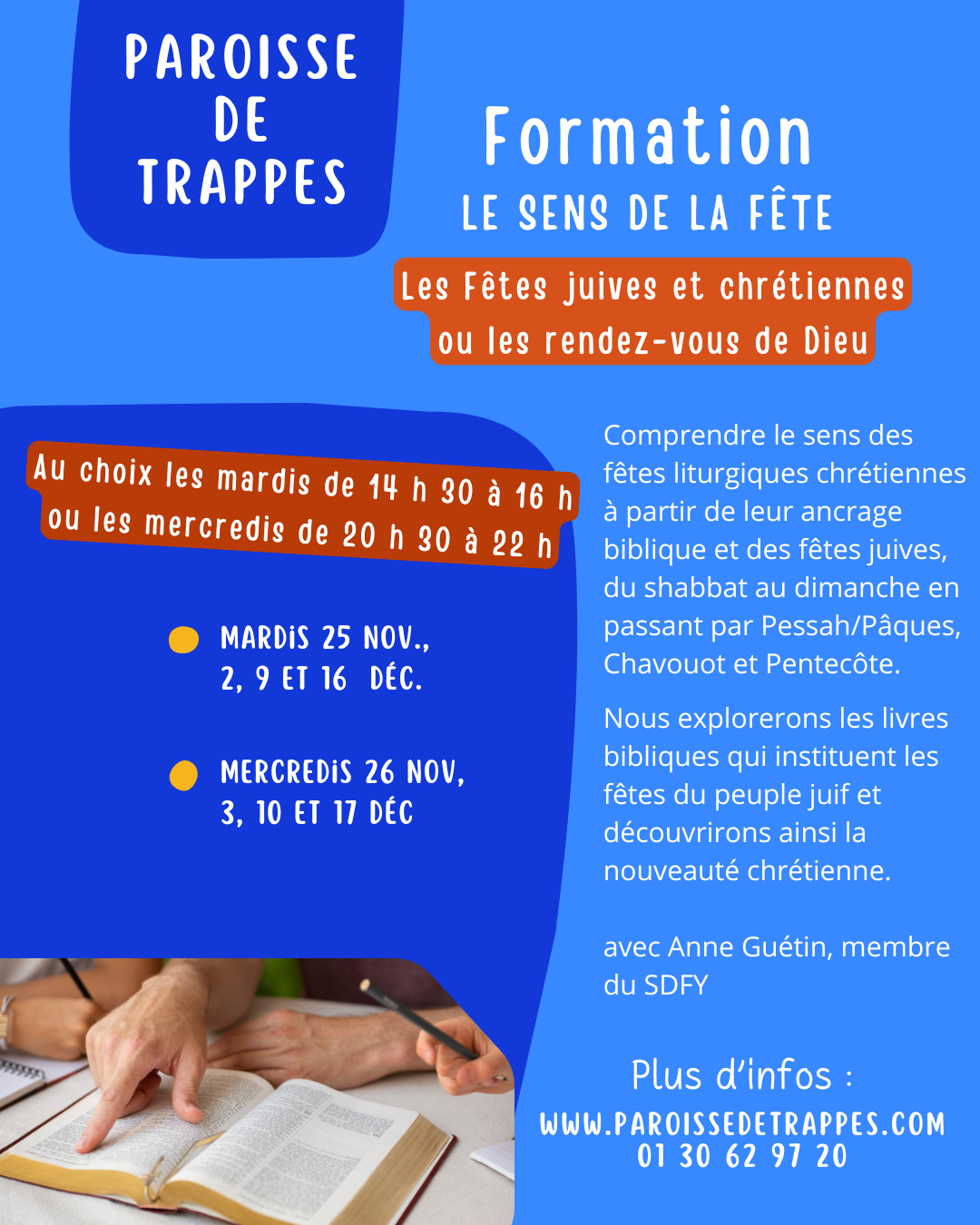 La paroisse de Trappes vous propose une formation sur « Le sens de la fête ». Le thème est : Les fêtes juives et chrétiennes ou les rendez-vous de Dieu
